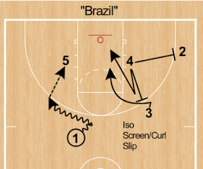Same concept but from the wing, opening a 3 or attacking the middle of the zone. The "dunker" can cut across and the weak side corner lifts to have a likely open 3.